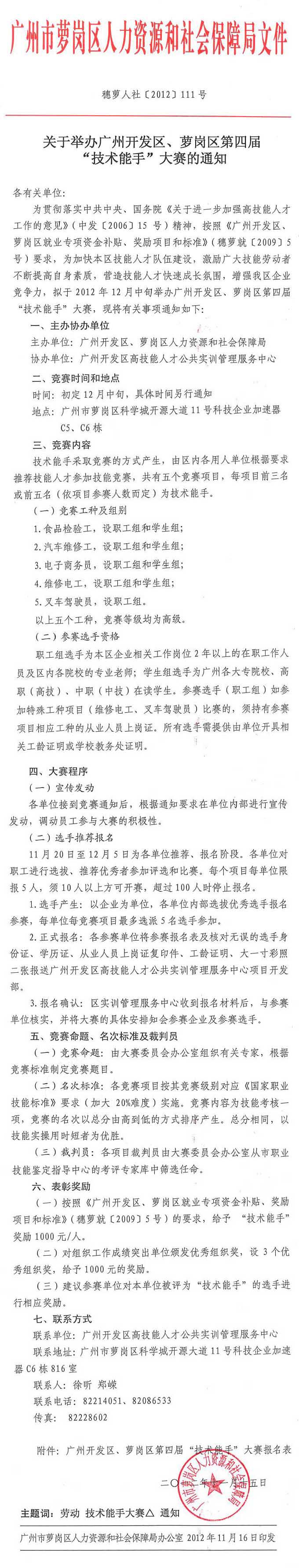 关于举办广州开发区、萝岗区第四届“技术能手”大赛的通知