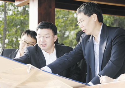 ▲李红卫(中)向吕德耀(右)介绍知识城南起步区最新进展情况