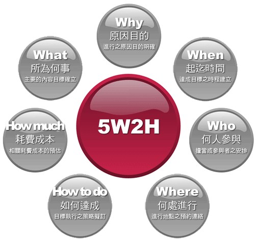 从概念上来讲何为5W2H?简单来说即是:What——工作的内容和达成的目标,Why——做这项工作的原因,Who——参加这项工作的具体人员,以及负责人,When——在什么时间、什么时间段进行工作,Where——工作发生的地点,How——用什么方法进行,How much——需要多少成本,简称“5W2H”。这种方法对于我们的日常管理与工作的开展有很大的帮助,特别适用于工作的周期安排与工作计划的落实,合理规避了盲目性工作的弊端。