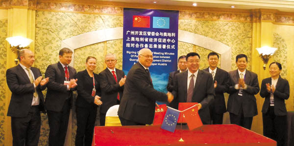 11月28日上午,第九次中欧区域政策高层研讨会在成都召开。在国家发改委地区经济司司长刘苏社、欧盟地区政策和城镇化总司顾问罗纳·德霍尔、广东省发展和改革委副巡视员魏济章等见证下,管委会副主任、区长李红卫与奥地利上奥地利省经济促进中心主任布鲁诺·林道夫尔代表双方签署结对合作备忘录。副区长许芳参加了签约仪式。