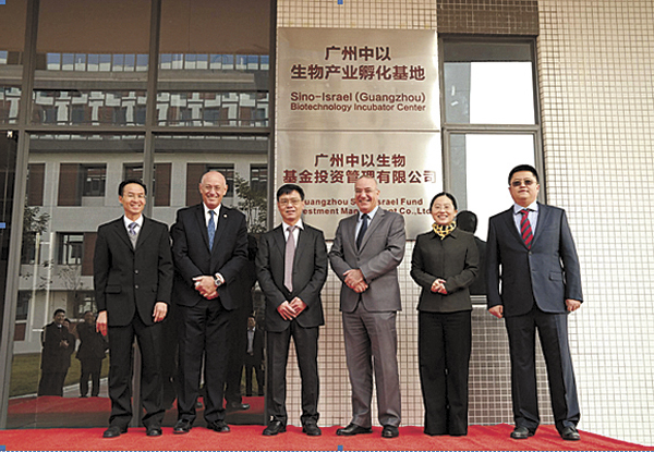 广州市发改委副主任张晓波、副区长许芳、苏格·基莱特曼博士、以色列驻广州总领事馆安亚杰、及广州产业投资基金管理有限公司、区工业发展集团相关负责人共同为中以生物孵化基地揭牌。