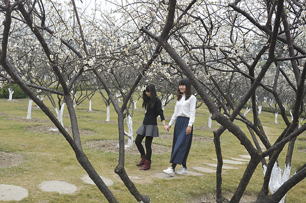青梅争俏犹飞雪 花梅接棒绽娇颜
