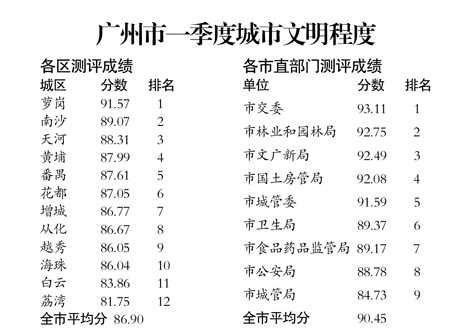 日前,广州市文明办、市创建办发布2015年第一季度各区文明程度指数测评和重点部门专项测评情况。一季度全市12个城区的文明程度指数测评平均分为86.90分,成绩排名依次为萝岗、南沙、天河、黄埔、番禺、花都、增城、从化、越秀、海珠、白云、荔湾。9个重点市直部门专项测评的平均分为90.45分,成绩排名依次为市交委、市林业和园林局、市文广新局、市国土房管局、市城管委、市卫生局、市食品药品监管局、市公安局、市城管局。问卷调查中,99.7%的受访市民支持开展创建全国文明城市工作。