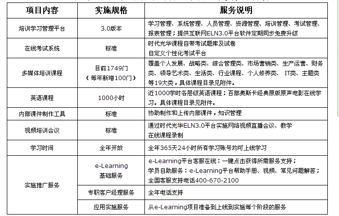 四、平台:由时代光华承担,时代光华是中国首家提供企业E-Learning PAAS完全外包服务的供应商,其运营平台正版课件数(3254门)和一流讲师数(700多名)均排全国第一,终端学员已经达到200多万,目前已成功服务超过5000多家中国企业,是目前中国企业客户及学员数最多的E-Learning提供商。