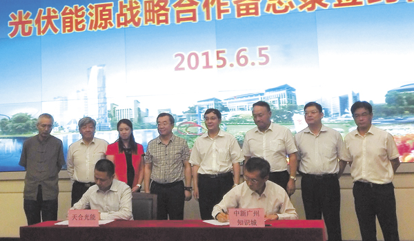 6月5日下午,中新广州知识城投资开发有限公司与江苏天合太阳能电力开发有限公司(下称天合光能)签署了分布式光伏能源发展战略合作备忘录。市委常委、管委会主任、区委书记陈志英,管委会副主任、常务副区长孙秀清,天合光能有限公司董事长兼首席执行官高纪凡参加签约仪式。