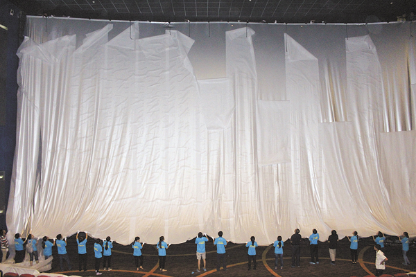 在进行了简单的流程讲解后,工作人员邀请现场影迷参与其中,与16名幕后铁架上的工作人员一起完成了这块IMAX银幕的拔地而起。据悉,萝岗万达影城的IMAX银幕是广州第6块IMAX银幕,其尺寸为宽22米高12米,影厅座位有377个,相信最终呈现出的效果一定能够让观众感受到 IMAX的惊艳和震撼。
