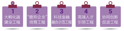 实施大孵化器建设工程等五大创新工程,加快集聚创新资源,提升产业竞争力和自主创新能力,推动创新驱动发展。
