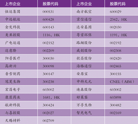 截至目前,广州开发区、黄埔区累计上市企业达34家,约占全市的1/3,“新三板”挂牌企业29家,约占全市的40%,成为广州市上市企业和“新三板”企业密集区域。代表企业有: