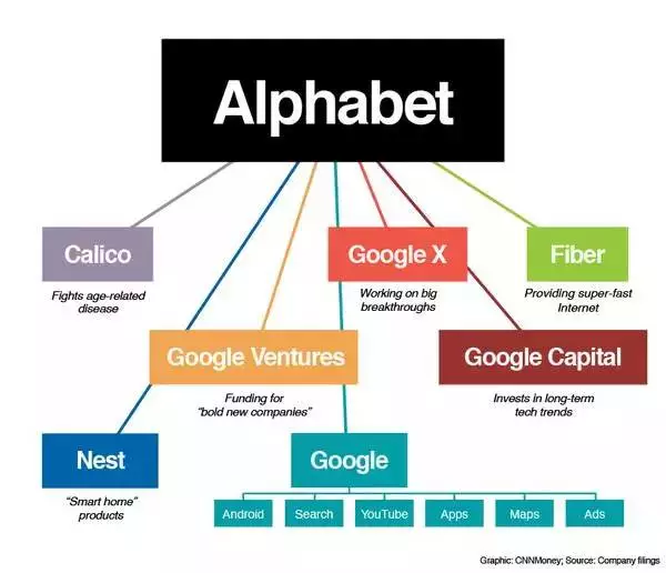 Alphabet是Google成立的一个母公司,由 Larry Page 担任CEO,Sergey Brin 担任董事会主席。Alphabet 下面会拥有一系列的按照业务线独立出来的全资小公司,比如 现在的这个 Google,X-Lab,Life Sciences,Ventures & Capital和其他。这次新公司的成立更加像是一次组织架构的调整,用来修整之前相对臃肿的Google,另外能更加明确每个事业部(子公司)的职责和成绩。