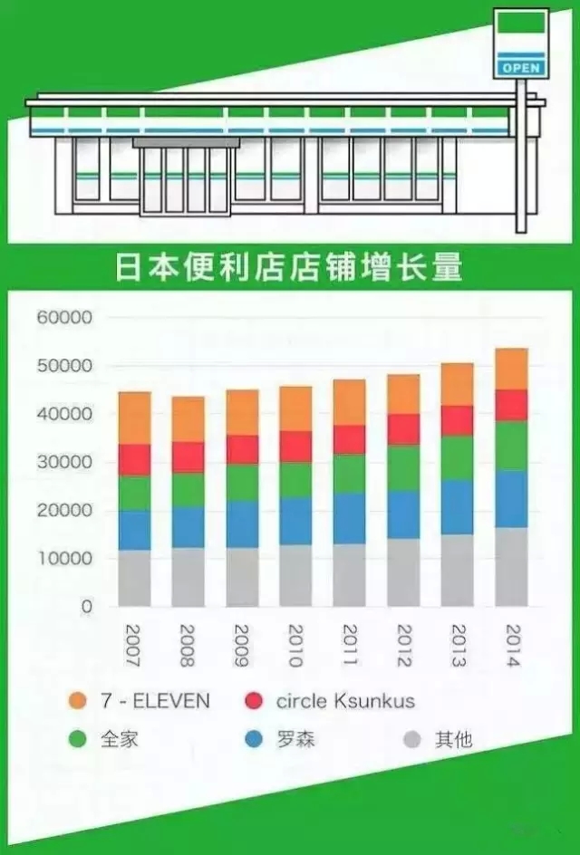 引起我们注意的还有另一组数据:2014年日本便利店的国内市场规模首次超过了10万亿日元,远超百货商场和药妆店6万亿日元的规模,仅次于超市(18万亿日元)。其中 7-Eleven 的销售额为4万亿日元,全家以近 2 万亿日元的销售额首次超越罗森位列第二,前三名便利店销售总额占据了80%的市场份额。