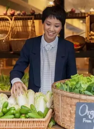 何奕佳经常和父亲来这里与员工探讨研究。一身牛仔裤与布鞋的装扮,方便随时下田耕作,了解实地种植的困难度,再将这些心得一一拿回去进行改进。为了卖有机蔬菜,何奕佳还亲自上电视购物节目。
