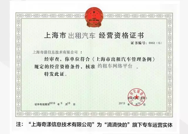 10月8日,上海市交通为正式向滴滴快的颁发网络约租车平台经营资格许可,这是国内第一张专车平台资质许可,滴滴快的成为第一家获得网络约租车平台资质的公司。