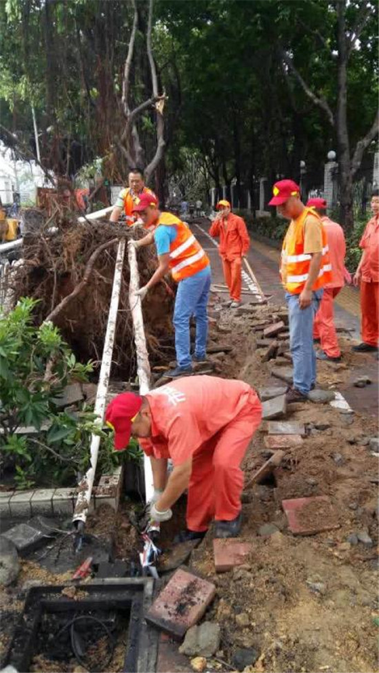 二是组织有力,措施到位。在局领导带领下,抢险成员单位服从指挥和调配,抢险期间共出动绿化和市政工人约1300多人、车辆800多辆次,对开发大道、保金路、环保东路、保盈大道等路段受损的绿化、市政设施进行及时清理和修复,共清运铁皮木棍等杂物42车,清运绿化垃圾1252立方米。确保了沿线道路畅通、路面不再积水,路灯供电得到及时恢复。