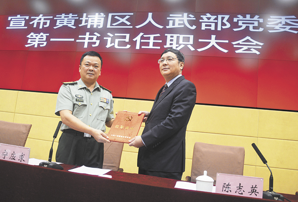 10月29日,黄埔区召开人武部党委第一书记任职大会,任命市委常委、区委书记陈志英为区人武部党委第一书记。广州警备区司令员宁应求代表警备区党委,宣读了区人武部党委第一书记任职批复,任命陈志英为黄埔区人武部党委第一书记,并颁发任职证书。广州警备区政委王成,黄埔区委副书记、区长李红卫,黄埔区委常委、区委办区政府办主任陆小荣,黄埔区委常委、区人武部部长王任飞出席大会。