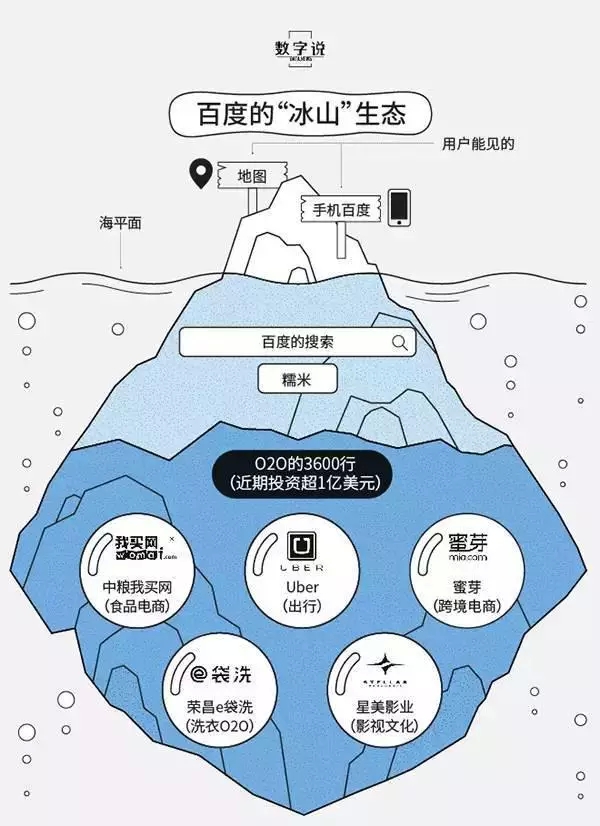 海面上是手机百度和百度地图两大入口,中部是核心业务搜索,海底则是O2O(线上线下连接)的3600行。