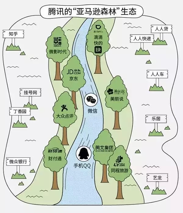 森林中央是腾讯自己的线上内容,以微信和手Q两大社交平台输血投资领地,最终实现连接一切“树木”。