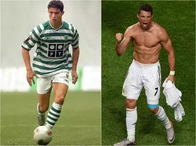 这是C罗青年时踢球的照片,那时候每个人都说他踢球非常有天赋,但是身体实在太瘦了。为此,C罗开始锻炼身体,增加自己的身体素质,从一个瘦子炼成了世界足球先生的肌肉男。