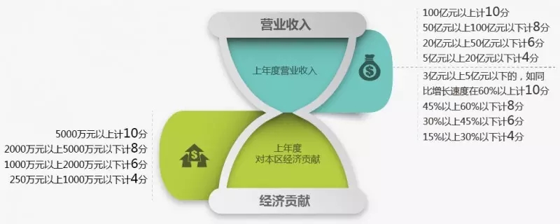 上年度对本区经济贡献5000万元以上计10分,2000万元以上5000万元以下计8分,1000万元以上2000万元以下计6分,250万元以上1000万元以下计4分。