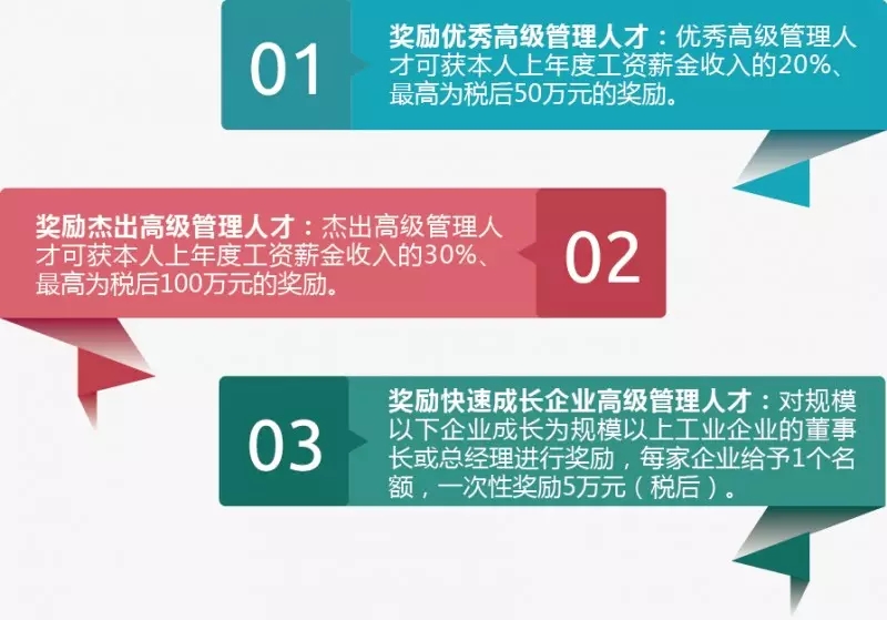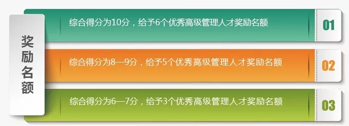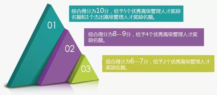 3.以贡献论英雄,体现市场主导作用。优秀高级管理人才的奖励标准,按奖励对象上年度工资薪金收入的20%、最高不超过50万元(税后)计算;杰出高级管理人才奖励标准,按照奖励对象上年度工资薪金收入的30%、最高不超过100万元(税后)计算。薪资是个人对企业贡献的直接体现,奖励与个人薪资挂钩,不再采取一刀切的方式,能够更真实的反映高级管理人才的贡献,同时也突出了市场在配置人才资源上的主导作用。