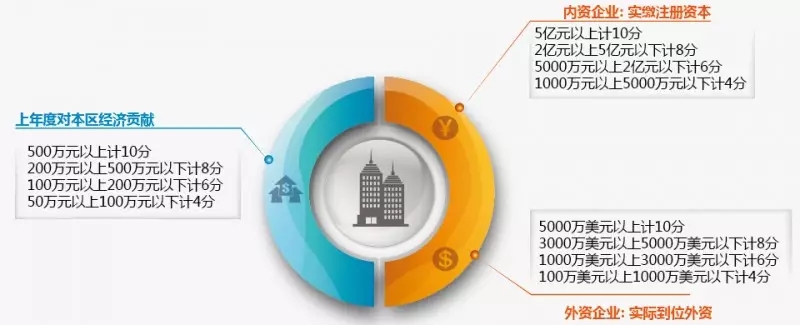 外资企业:实际到位外资在5000万美元以上计10分,3000万美元以上5000万美元以下计8分,1000万美元以上3000万美元以下计6分,100万美元以上1000万美元以下计4分。