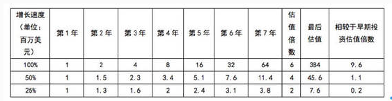 如果我们建立三种不同增长速度的模型——100%,50%和25%——那么在接下来的6年,增长最快的那家公司可以收获风险回报。这家公司将增长到6400万美元的年营收,假设估值是营收的6倍(对于这种规模这样成长速度的公司,这个倍数假定是合理的),那这家公司的估值将接近4亿美元。假设这种公司在成长过程中需要差不多2000~3000万美元的融资(或许2~3轮),并假设早期投资时的项目估值是4000万美元(同样,这也是根据我经验的一个合理假设),那么,最后就实现了10倍回报。