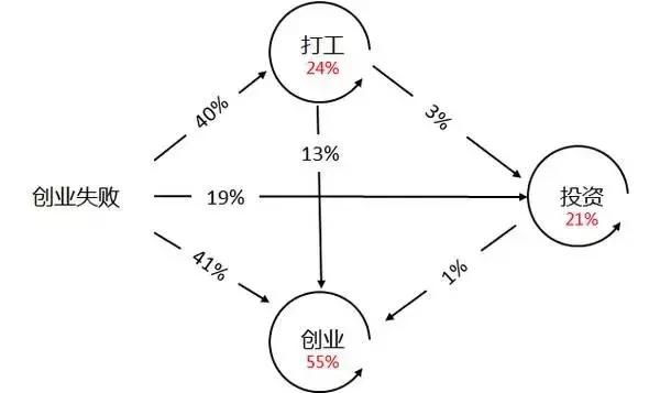 讨论这个问题非常适合放出这张图,是关于创业者在失败后走向的统计。总体来说,创业是一种癌,很难戒掉(55% 的创业者在失败后会再次选择创业)。即使创业失败回到大公司打工蜗居,仍有 60% 左右的人会在短暂调整后再次选择创业。