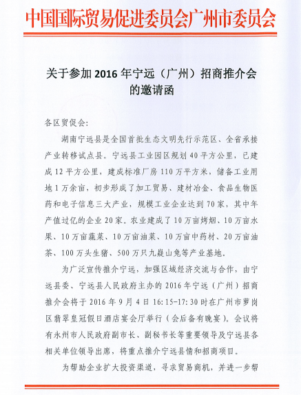 市贸促会拟组织区内各相关企业参加由宁远县委、宁远县人民政府主办的“2016年宁远(广州)招商推介会”将于2016年9月4日(下午16:15-17:30)在广州开发区翡翠皇冠假日酒店宴会厅举行(会后备有晚宴)。永州市人民政府副市长、副秘书长等重要领导将出席会议,并重点推介宁远县情和招商项目。