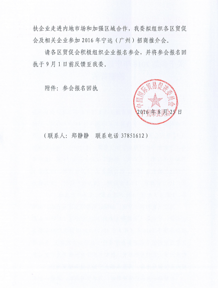 现烦请区内各行业协会发动会员企业积极报名参会,并将参会报名回执与9月1日前反馈至一下联系方式: