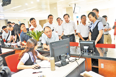 在上午的现场考察中,陈华江带领与会人员来到广州开发区政务服务中心集中审批区,听取了区行政审批局局长郑勇关于组织架构、集中审批方式和集中审批流程再造等工作汇报,仔细查看了审批卷宗。