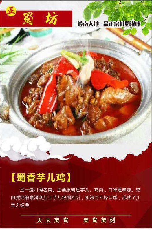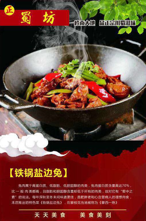 正蜀坊川菜系,其特点以亲民平和,调味丰富,丰富的菜品。正蜀坊川菜讲求用料精细准确,严格以传统经典菜谱为准,其味温和,绵香悠长,同时集中了川菜中的铁锅系列 和水煮系列,通常颇具典故。精致细腻,多为流传久远的传统川菜。