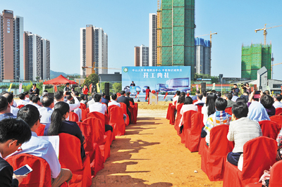 11月3日上午,中新广州知识城首家三甲医院——中山大学肿瘤防治中心知识城院区项目正式动工。管委会常务副主任、黄埔代区长陈小华,管委会副主任谭明鹤等出席开工仪式。