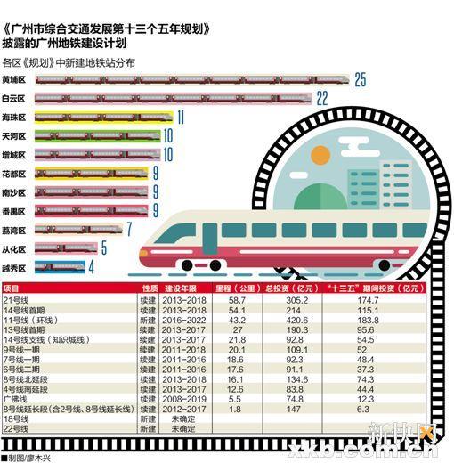 近日,广州地铁发布消息称,6号线二期与7号线一期将在今年年底开通,6号线二期从天河东部至黄埔,7号线一期则横贯番禺东西部。由此可见,广州的“地铁家族”越来越壮大了。那么,未来广州还将建设哪些地铁线路,地铁站在各区的分布是怎样的?新快报记者近日梳理《广州市综合交通发展第十三个五年规划》(以下简称《规划》)发现,“十三五”期间广州将新开通11条地铁线路,均是续建项目。此外,《规划》中还有3条新建线路,,1号线(环线)的建设年限从今年至2022年,预计将到“十四五”才能开通。18号线与22号线的建设年限则尚未确定。新增地铁站方面,黄埔区和白云区均超过20个,黄埔区最多,有25个。
