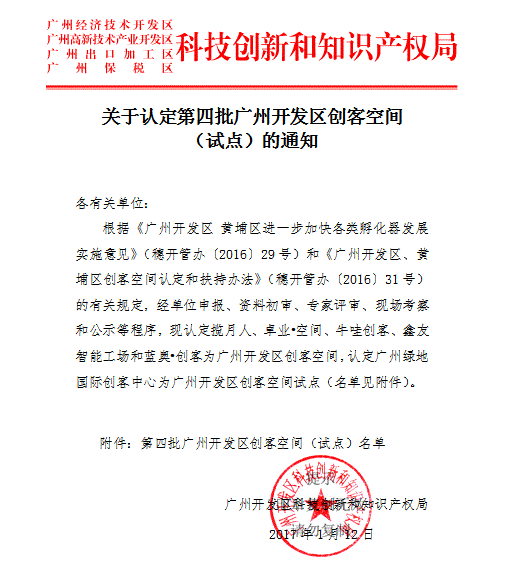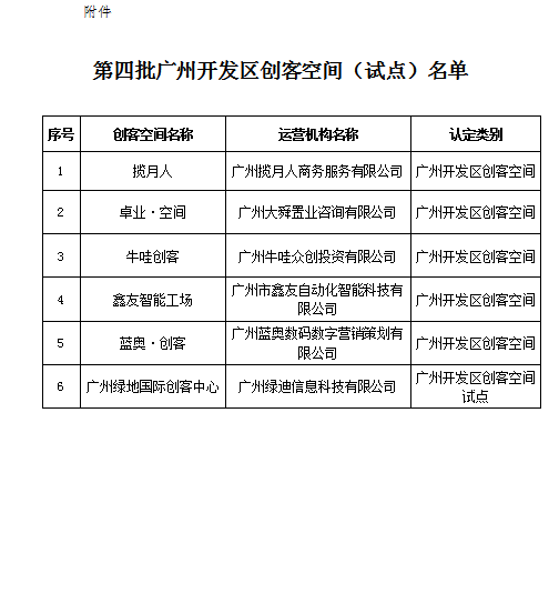 根据《广州开发区 黄埔区进一步加快各类孵化器发展实施意见》(穗开管办〔2016〕29号)和《广州开发区、黄埔区创客空间认定和扶持办法》(穗开管办〔2016〕31号)的有关规定,经单位申报、资料初审、专家评审、现场考察和公示等程序,现认定揽月人、卓业·空间、牛哇创客、鑫友智能工场和蓝奥?创客为广州开发区创客空间,认定广州绿地国际创客中心为广州开发区创客空间试点(名单见附件)。