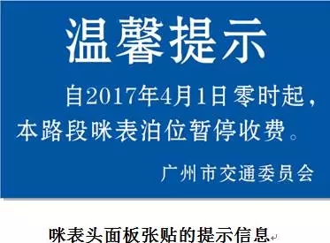 3月29日,市交委、发展改革委、公安局和财政局联合发布公告,经广州市人民政府同意,自4月1日起,在本市确定城市道路咪表泊位新的管理措施之前的过渡期内,合同期满的原咪表泊位暂停经营和收费,市民可免费停车。此次公告暂停经营和收费的中心六区咪表泊位共5932个,占中心六区现有咪表泊位总数的89.26%。