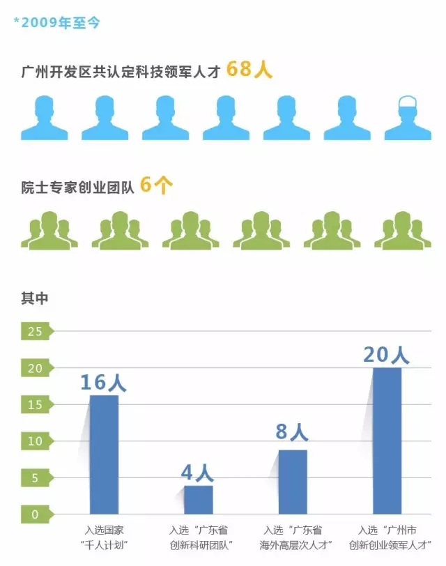 2009年至今,我区共认定科技领军人才68人,院士专家创业团队6个。其中,16人入选国家“千人计划”,4人入选“广东省创新科研团队”,8人入选“广东省海外高层次人才”,20人入选“广州市创新创业领军人才”。