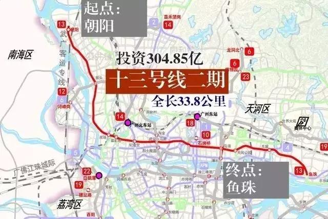十三号线二期工程(朝阳~鱼珠),主要沿规划的槎神大道、现状的增槎路、东风路、黄埔大道、中山大道行进。线路长为33.8 km,均为地下线敷设方式;共设置21座车站,其中换乘站9座,初期投资估算总额为378.82亿元,计划工期为2017至2022年。