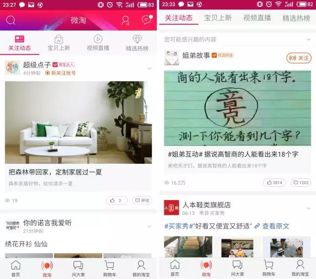 除了今日头条之外,淘宝还搭载了一个微博,第二个界面“微淘”。还记得你刚刚看的那篇种草清单吗,是由进驻了淘宝平台的内容创作者(淘宝达人)撰写,喜欢他的文章你可以关注他,喜欢哪家店你也可以关注——你所关注的账号动态,都会在“微淘”展示。