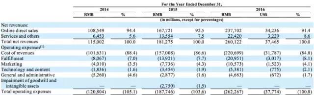 我们以图中京东2015-2016年的数据为例,其净营收从1812.75亿上涨为2601.22亿元,涨幅43.5%。全部的运营支出则从2015年的1877.46亿元上涨为2622.67亿元,涨幅39.7%。