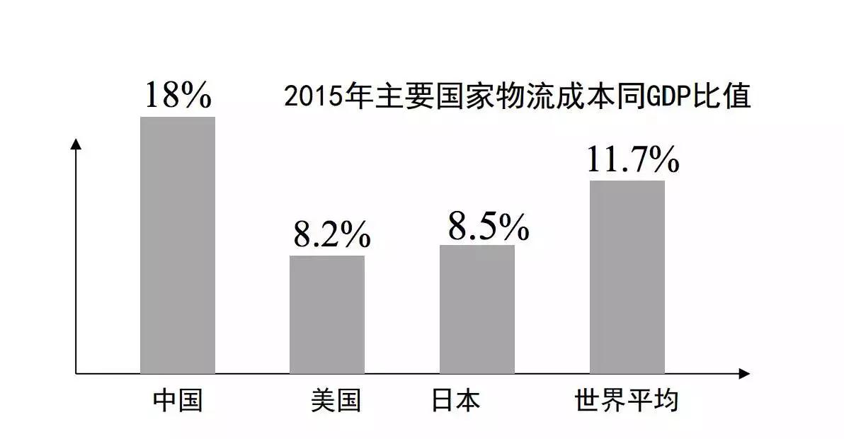 在上图中我们知道,中国物流成本占GDP的比例高达18%,而同时发达国家则将这一比例控制在8%左右,其中美国为8.2%,日本为8.5%,世界平均水平在11.7%,即中国的物流成本是在世界水平线之下的,有巨大的提升空间。