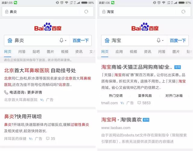 最明显的是整个搜索结果的视觉变化,从原来的红蓝黑配色到如今的红黑灰,整体来说界面更加清爽(性冷淡)。再细心留意一下,会发现,搜索不同的关键词,搜索框下方的导航也会有不同的排列,搜索“鼻炎”,排在“网页”之后的依次是“问答”、“贴吧”和“图片”等;如果搜索“淘宝”,导航栏之后则依次是“应用”、“视频”和“资讯”等。