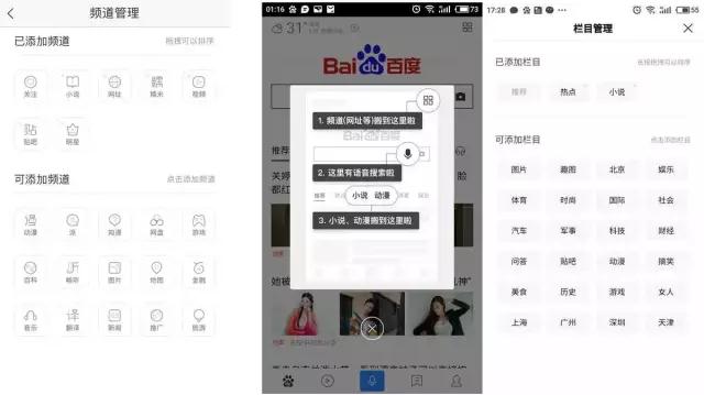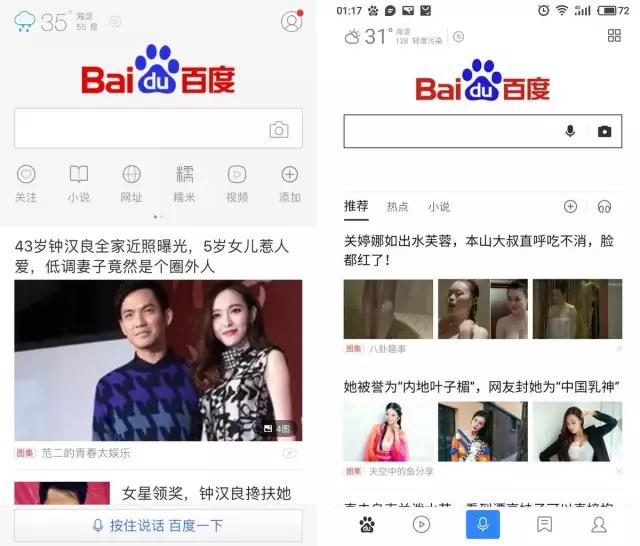 原来搜索框下的导航频道被收到了右上角,取而代之的是Feed流上方增加了不同领域的内容。原来的贴吧、糯米等频道性质多是百度不同的产品,现在的体育、时尚等栏目则更像新闻APP中内容频道。