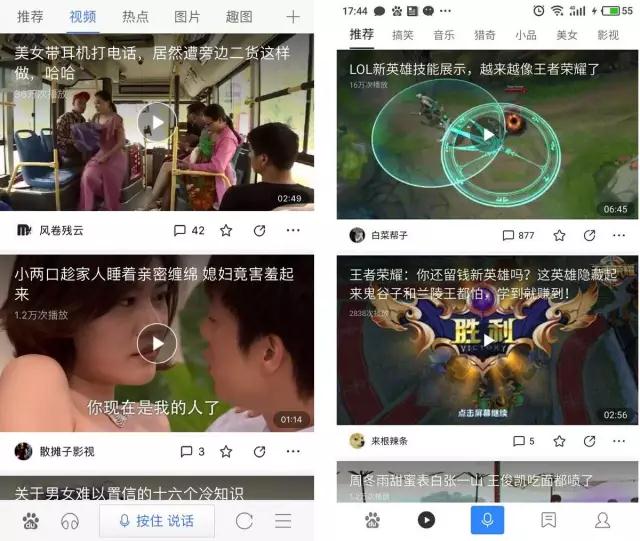 原来频道中内容属性比较强的“小说”、“视频”和“关注”被继续保留在主界面,“视频”和“关注”分别放到了一级界面下方的菜单栏,若点击新的视频频道,会看到视频上方也出现“搞笑”、“音乐”、“猎奇”等不同的栏目。短视频分类的维度更加丰富,这界面有点像一个短视频APP。