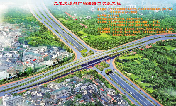 九龙大道与广汕路口立交工程,总投资3.3583亿元,呈东西走向,立交全长610米,设计时速为主道60公里/小时,辅道40公里/小时,九龙大道主线下穿,广汕公路主线跨线桥,在广汕公路上设置两座南北向人行过街隧道,同时在地面辅道和广汕路设计灯控十字交叉口。