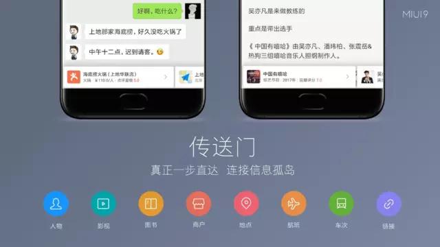 传送门:任何文字区域长按一下,通过简单的长按操作,触发手机系统对文字内容的智能分析,从而即时反馈用户最可能需要了解的信息标签,无需离开当前操作的页面即可快速预览搜索结果,或者进行分词选择。目前,MIUI9系统传送门功能已经支持人物百科、影视剧、书籍、商户、地理位置、链接及特殊链接预览、火车和飞机航班信息等多维度信息查询和推荐。