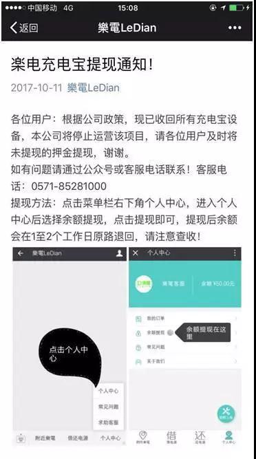 一家名为乐电LeDian的共享充电宝企业,在其官方微信公众号上发布停止运营的消息并提醒用户进行押金提现。