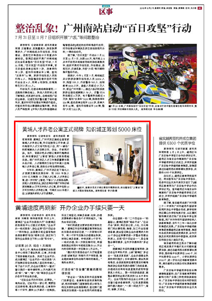 今年初,黄埔区、广州开发区定下强化人才资源支撑的发展目标:到 2020 年投入1000 亿元筹措 10 万套人才公寓、人才养老公寓,进一步打响“上管老、下管小”人才服务品牌,实现人才安居乐业。该区还将在中新广州知识城谋划筹建20万平方米的人才公寓,其中包括10万平方米的人才养老公寓,可满足5000长者入住,以承接未来的人才引进需求。