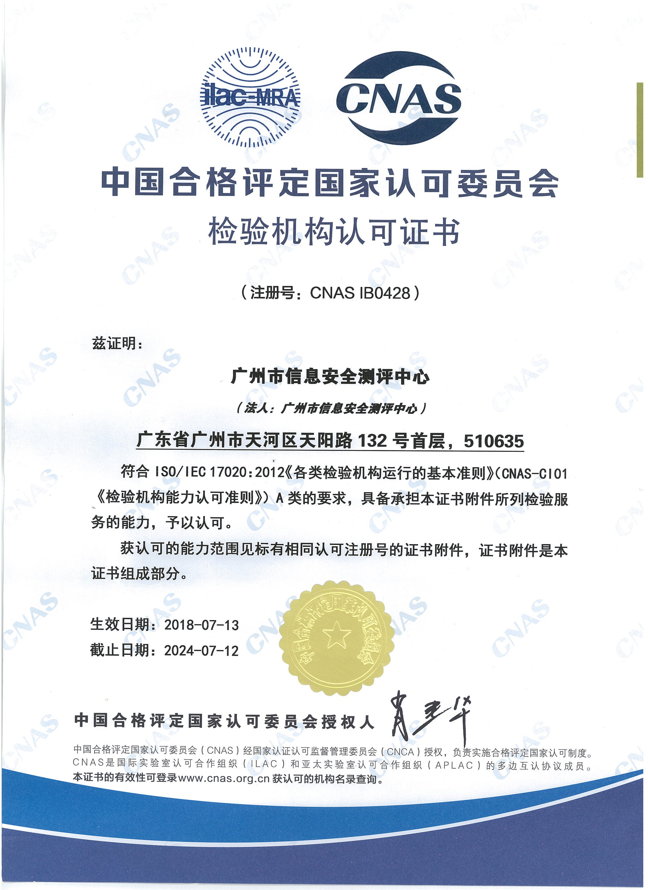市信息安全测评中心荣获中国合格评定国家认可委员会颁发的检验机构和实验室认可证书